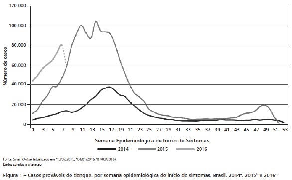 O gráfico abaixo, retirado do Boletim Epidemiológico 16 de 2016 do Ministério da Saúde, registra os casos de dengue por semana, no Brasil, nos anos de 2014, 2015 e início de 2016.